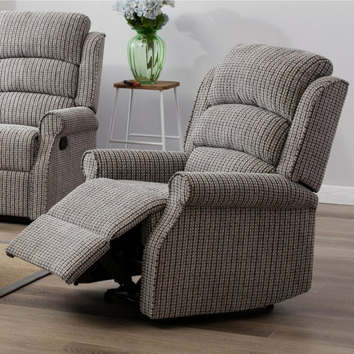 Traditional style full electric recliner with high back for support. Finished in a soft nubuck style textured fabric, buttons finished in a sleek b...